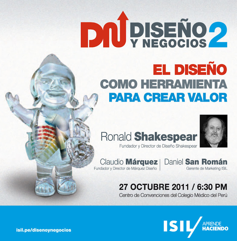 Lima, octubre de 2001. ISIL Aprende haciendo presentará este 27 de octubre a las 6:30 pm en el Centro de Convenciones del Colegio Médico del Perú, la segunda edición del evento internacional Diseño y Negocios 2: el diseño como herramienta para crear valor, que este año contará con la participación destacada del maestro Ronald Shakespear, de Argentina, considerado uno de los más grandes expertos en diseño en el mundo. Asimismo, participarán como expositores el diseñador argentino Claudio Márquez, director de Márquez Diseño, y el comunicador peruano Daniel San Román, gerente de marketing de ISIL.